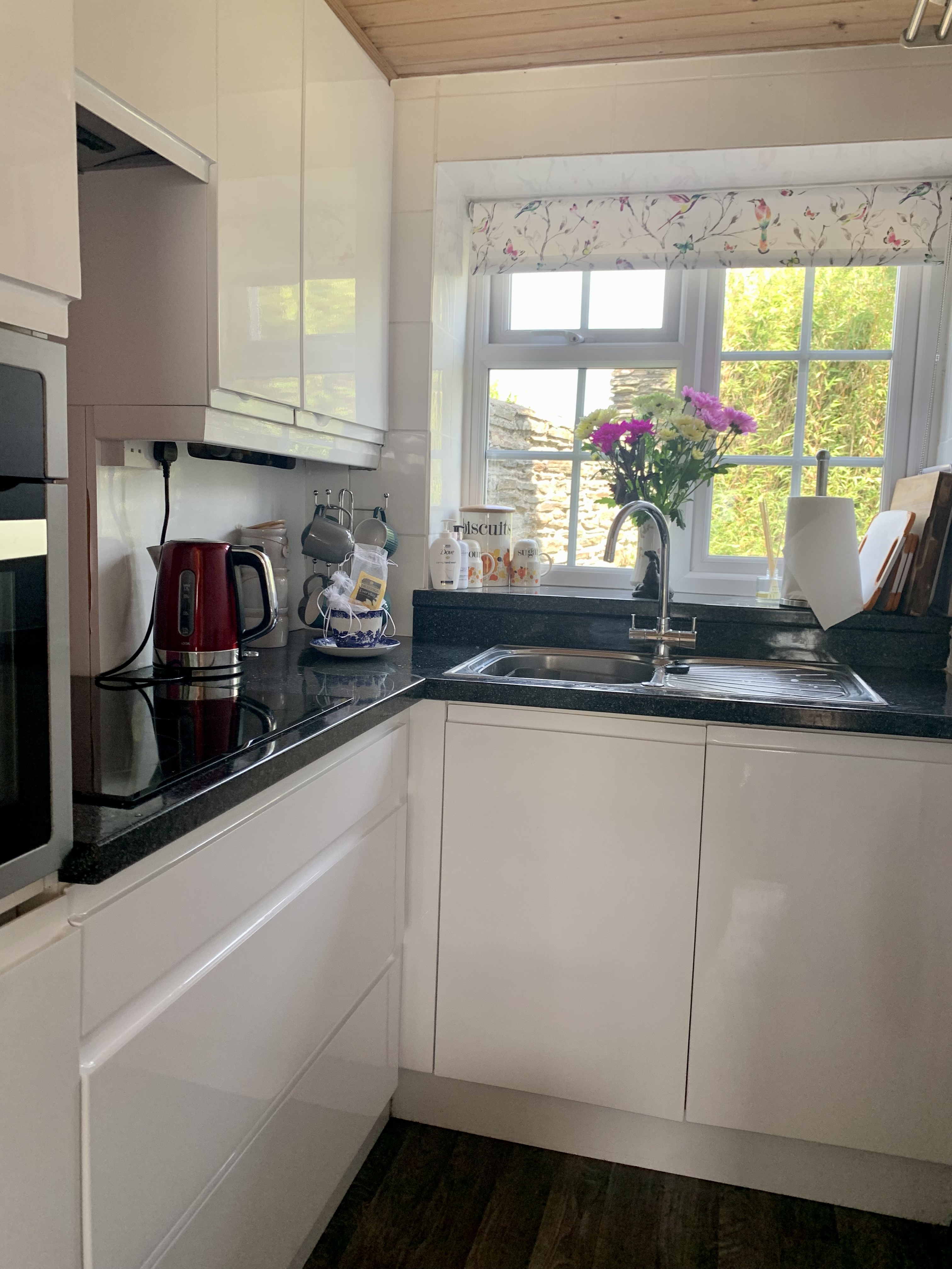 From the lounge there is a well equipped small kitchen, with a fridge (no freezer), a fully functional oven and microwave. Ceramic hob, kettle and all the utensils you will require for cooking and dining in.