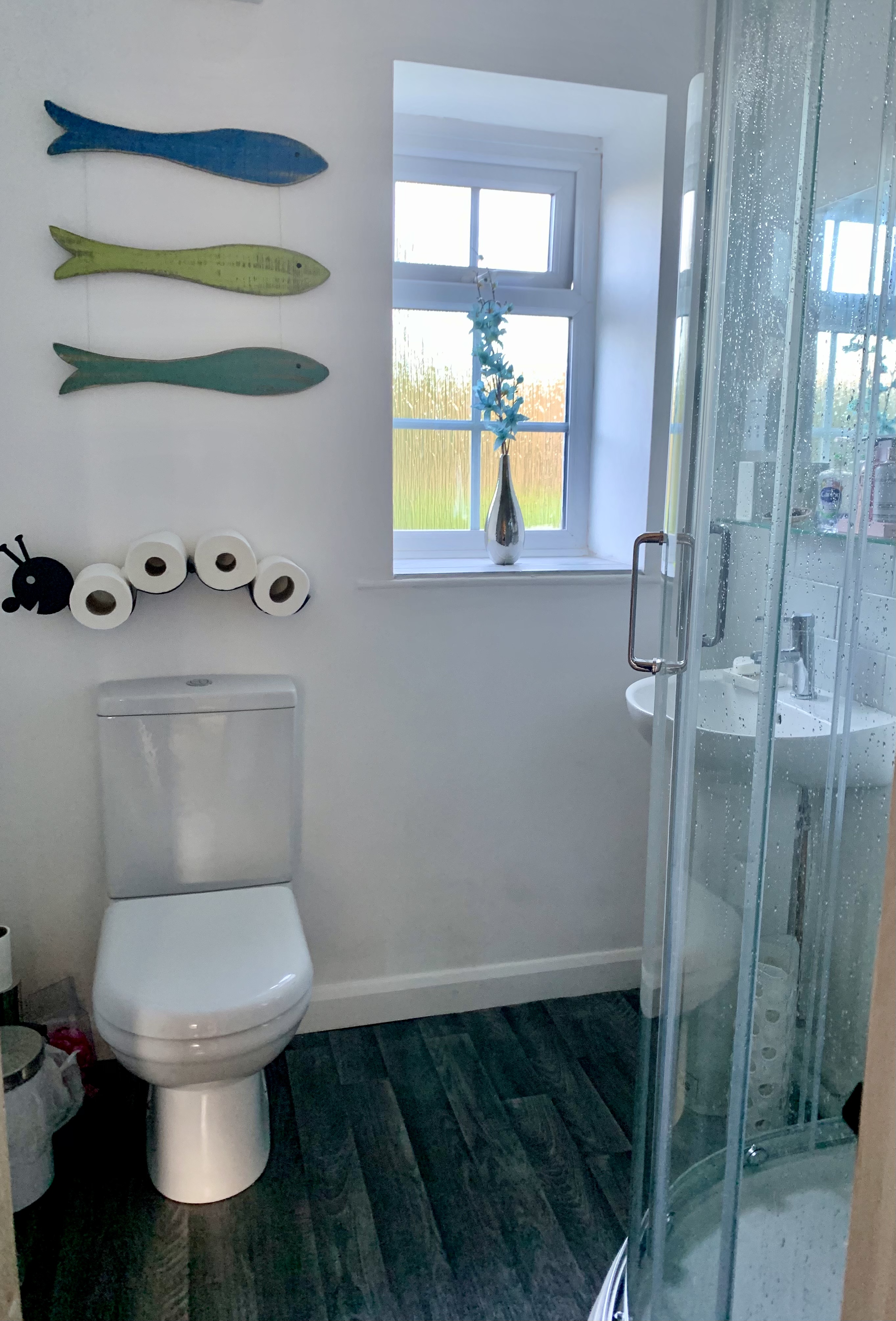 On the first floor there are two bedrooms, one with a king size bed that can be converted into two small single beds, the other bedroom has a double bed. Both rooms have integral cupboards with shelving and hanging space. The rear bedroom overlooks the BBQ area and garden with countryside view across the North Devon farmland. The front bedroom, overlooks the front courtyard with views across the countryside and the North Devon coast is in the distant. Linen is provided.