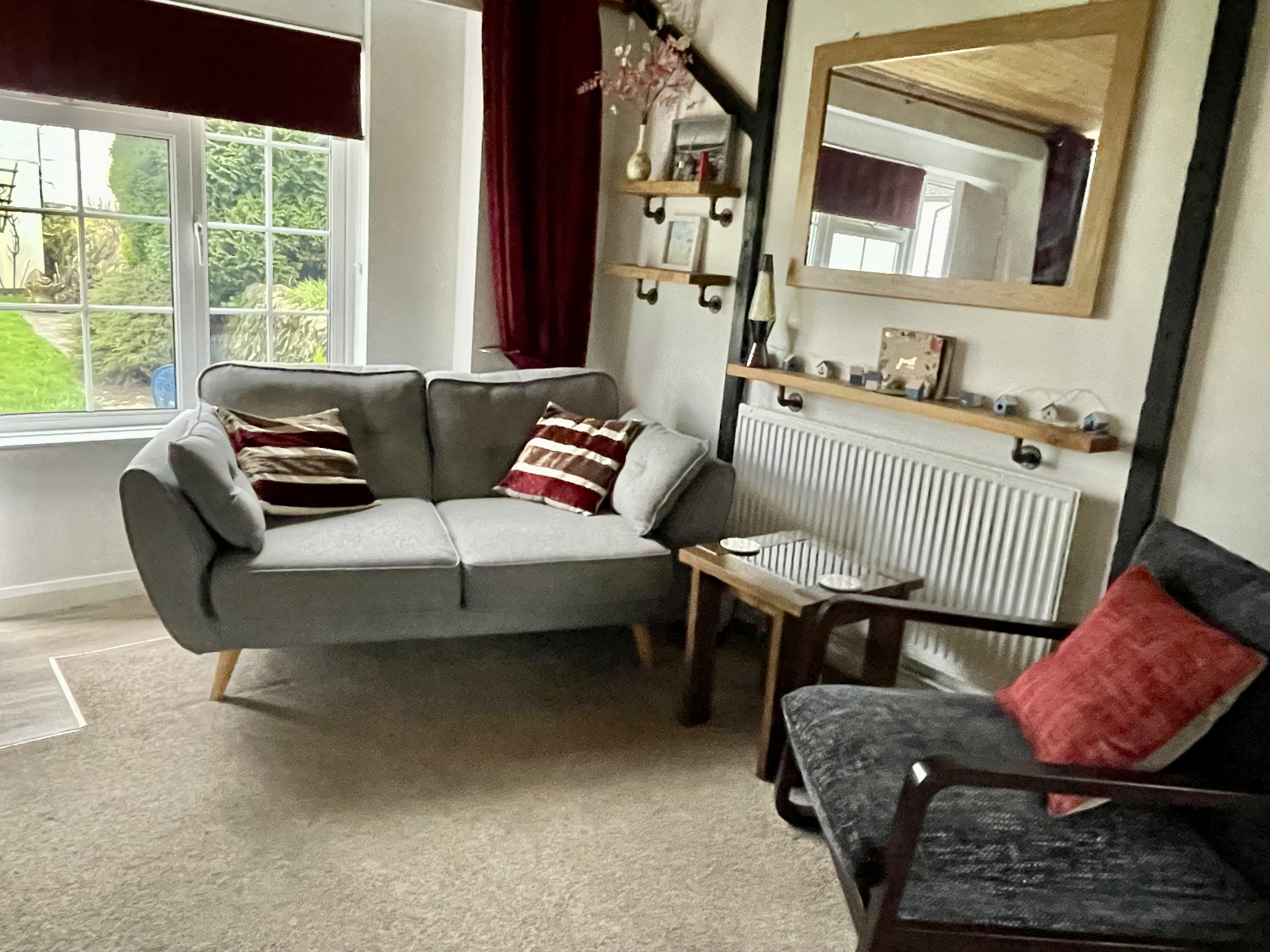 The front door opens into a carpeted lounge which has a sofa plus two occasional chairs to adequately seat four people. There is a DVD player, smart TV with access to streaming channels. Wifi