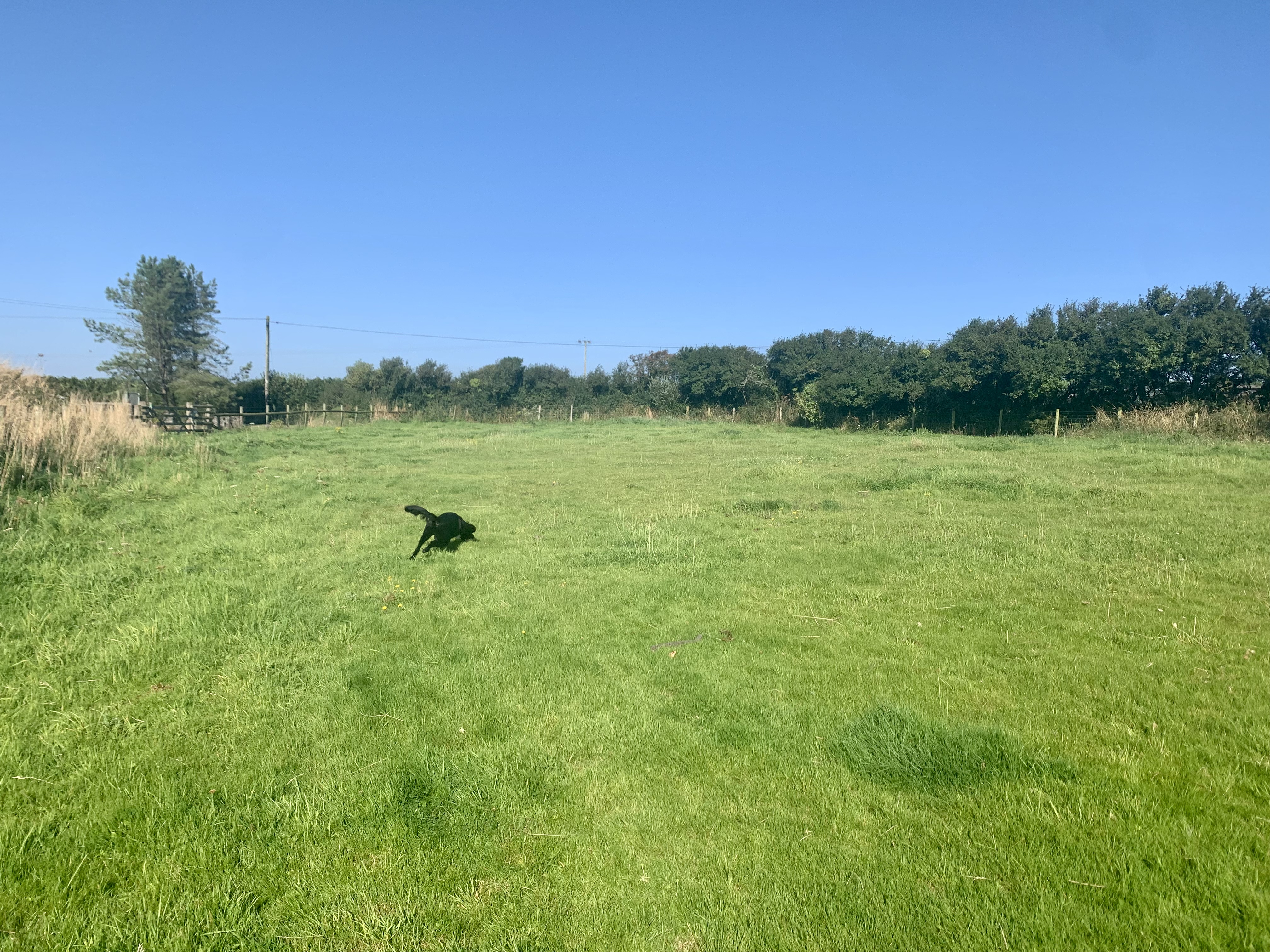 One dog welcome or two small/ medium dogs when occupancy is two people. Large enclosed dog exercise field within the grounds.
